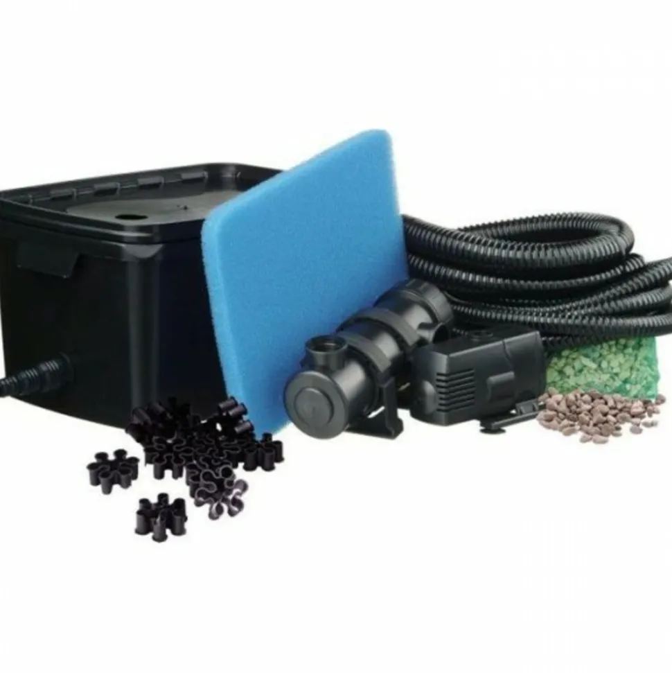 Cet ensemble de filtres avec une pompe d’étang et une lampe UVC est placé sur le bord de l’étang pour filtrer l’eau de l’étang.