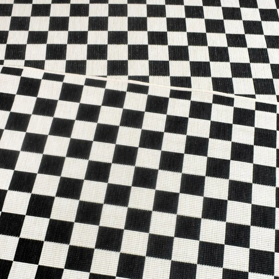 Tapis extérieur est idéal pour la décoration de la maison. Aux motifs Géométrique, tapis extérieur a été sélectionné pour son visuel, ses couleurs, mais aussi pour sa qualité. Il habillera à merveille tous types d’intérieur qu’ils soient modernes ou classiques. tapis extérieur, kilim reversible 120×170 motif damier A REVERSIBLE noir et blanc