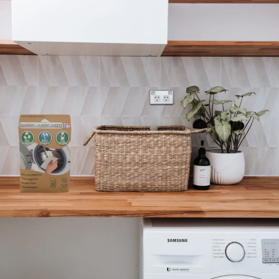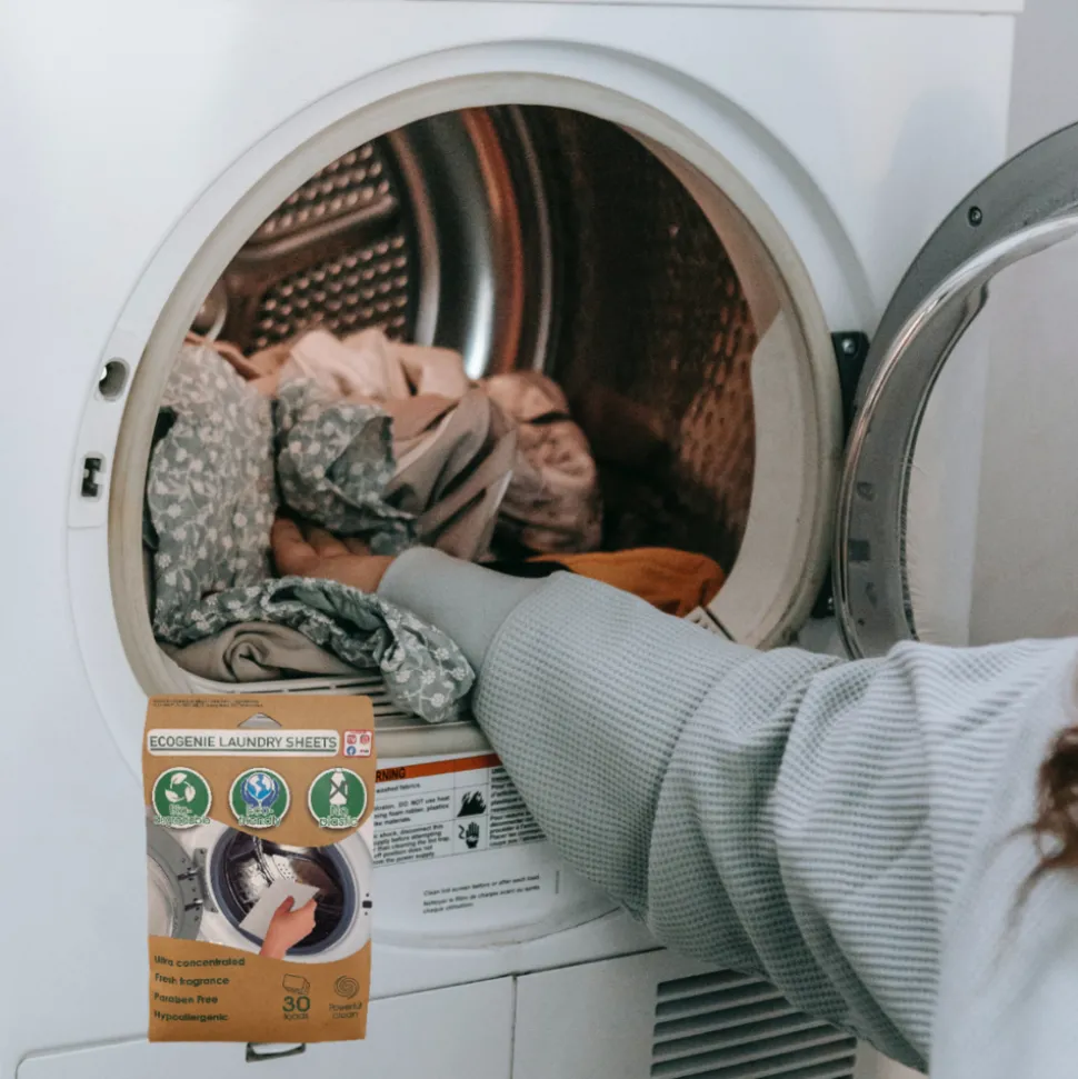 Lessive écologique et efficace : détergent à base de feuille biodégradable complétement soluble qui contribue à réduire la quantité de carbone.