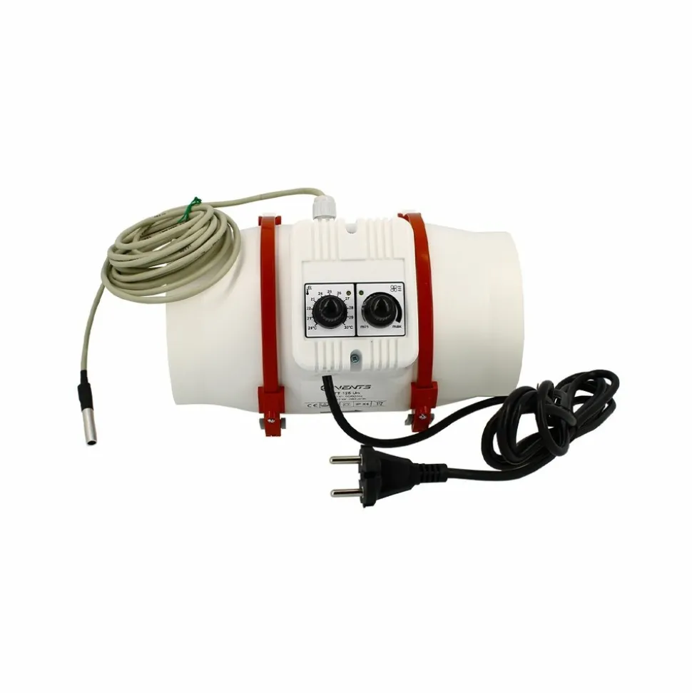 Cet extracteur de ventilation Turbo Tube 125 dispose d’un bouton pour le contrôle de la vitesse et d’un bouton de commande du thermostat pour régler le point de consigne de température.