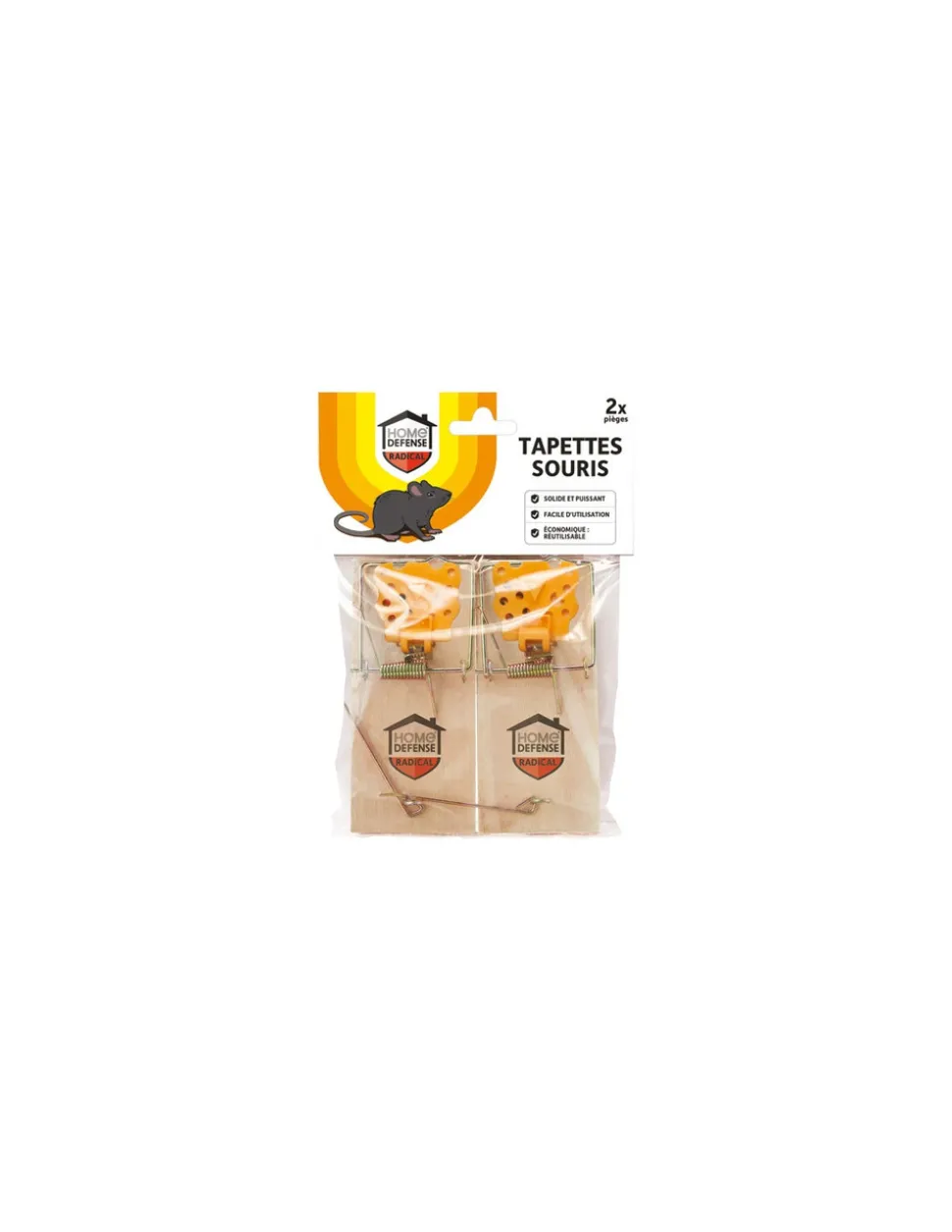 2 pièges traditionnels au mécanisme simple. Très solides. Déposer un appât (fromage, chocolat ) sur la partie jaune du piège pour attirer les souris.