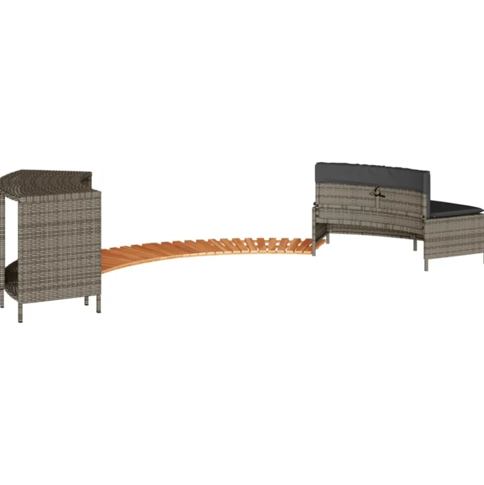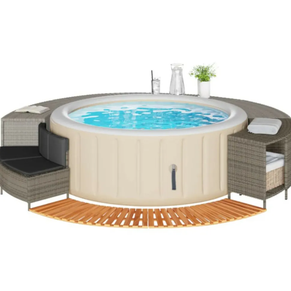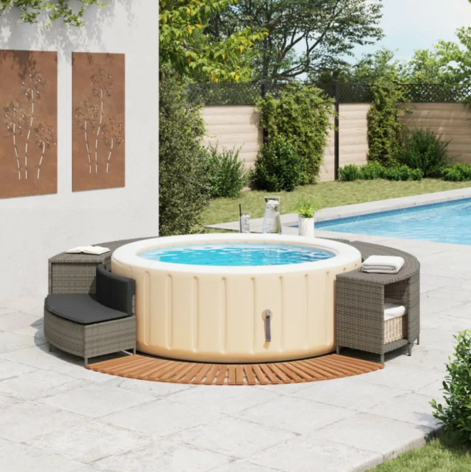 Améliorez l’expérience du spa pour vous et vos invités avec cet élégant cadre de spa. Matériau durable : la résine tressée, également connue sous le nom de poly rotin, est un matériau synthétique solide et nécessitant peu d’entretien qui ressemble au rotin naturel. Elle est légère, facile à nettoyer et couramment utilisée pour les meubles d’extérieur en raison de sa durabilité et de ses propriétés de résistance aux intempéries.Multifonctionnel : avec un support de rangement, une marche en bois et un banc de jardin, ce cadre de spa crée un espace de spa plus fonctionnel et plus convivial.Housse amovible et lavable : le coussin de siège est doté d’une housse amovible pour un lavage et un entretien faciles. La housse du coussin de dossier est dotée d’un rabat à l’arrière pour une fixation facile au dossier.Marche stable et sûre : la marche est fabriquée en bois d’acacia massif, offrant une surface stable et robuste pour des marches sécurisées.Cadre robuste et stable : le cadre en acier enduit de poudre assure la solidité et la stabilité du meuble de jardin pour une utilisation quotidienne à l’extérieur. Bon à savoir :Pour que vos meubles d’extérieur restent beaux, nous vous recommandons de les protéger avec une housse imperméable. Capacité de charge maximale (par siège) : 110 kgRésistance aux UVAssemblage requis : ouiBanc :Couleur : grisMatériau : résine tressée, acier enduit de poudreDimensions : 73/112 x 45 x 55 cm (L x l x H)Profondeur du siège : 43 cmHauteur du siège à partir du sol : 30 cmCoussin :Couleur : gris foncéMatériau de la couverture : tissu (100 % polyester)Matériau de remplissage : mousseDimensions du coussin de siège : 82/112 x 44 x 3 cm (l x P x é)Dimensions du coussin de dossier : 77 x 22 x 3 cm (L x l x é)Support de rangement :Couleur : noirMatériau : résine tressée, acier enduit de poudreDimensions : 78/112 x 45 x 55 cm (L x l x H)Marche :Matériau : bois d’acacia massif avec une finition à l’huile naturelleDimensions : 78/112 x 45 x 2,5 cm (L x l x H)La livraison contient :1 x banc1 x support de rangement2 x marche1 x coussin de dossier1 x coussin d’assise avec housse amovible et lavableCapacité de charge maximale (par siège) : 110 kgRésistance aux UVAssemblage requis : ouiBanc :Couleur : grisMatériau : résine tressée, acier enduit de poudreDimensions : 73/112 x 45 x 55 cm (L x l x H)Profondeur du siège : 43 cmHauteur du siège à partir du sol : 30 cmCoussin :Couleur : gris foncéMatériau de la couverture : tissu (100 % polyester)Matériau de remplissage : mousseDimensions du coussin de siège : 82/112 x 44 x 3 cm (l x P x é)Dimensions du coussin de dossier : 77 x 22 x 3 cm (L x l x é)Support de rangement :Couleur : noirMatériau : résine tressée, acier enduit de poudreDimensions : 78/112 x 45 x 55 cm (L x l x H)Marche :Matériau : bois d’acacia massif avec une finition à l’huile naturelleDimensions : 78/112 x 45 x 2,5 cm (L x l x H)La livraison contient :1 x banc1 x support de rangement2 x marche1 x coussin de dossier1 x coussin d’assise avec housse amovible et lavable