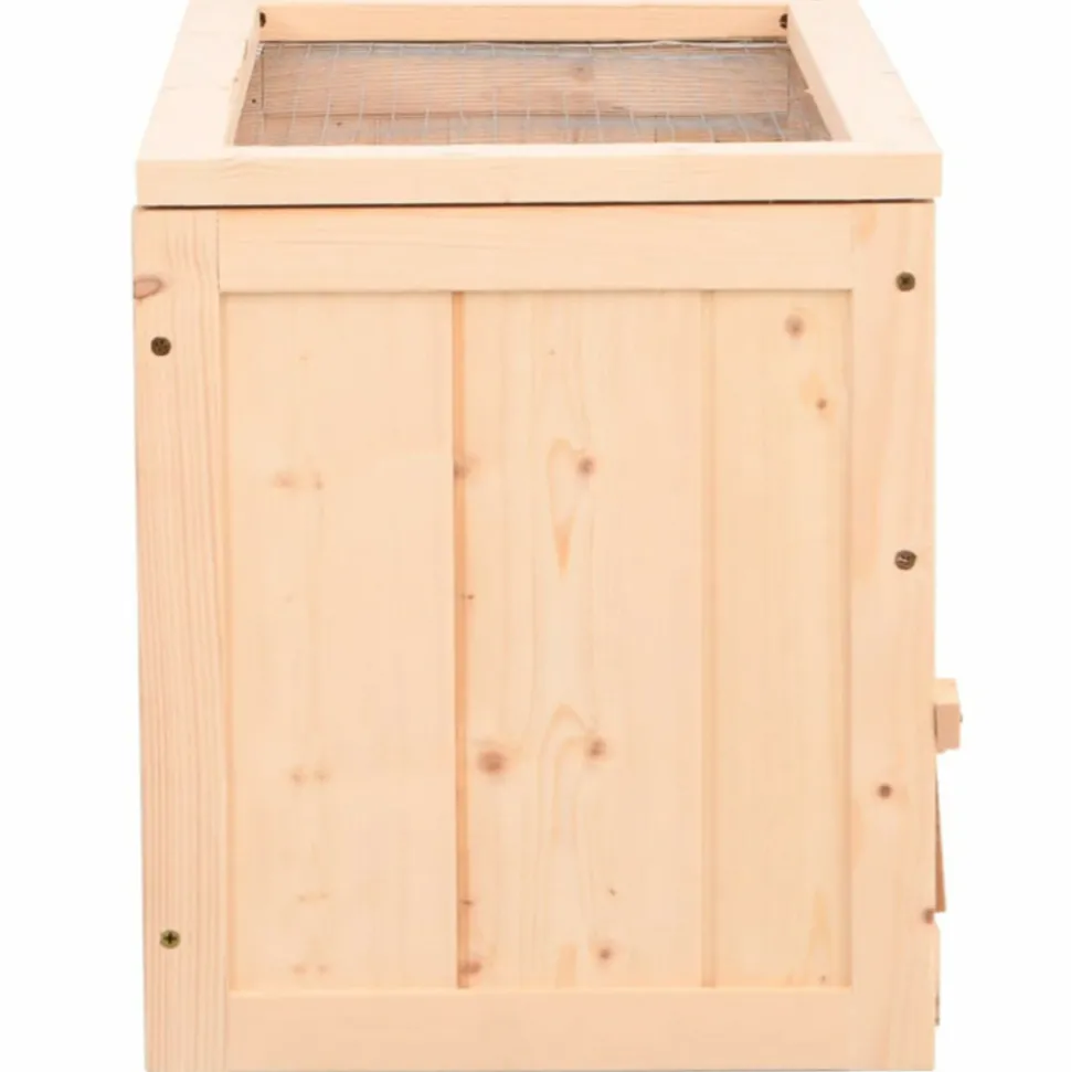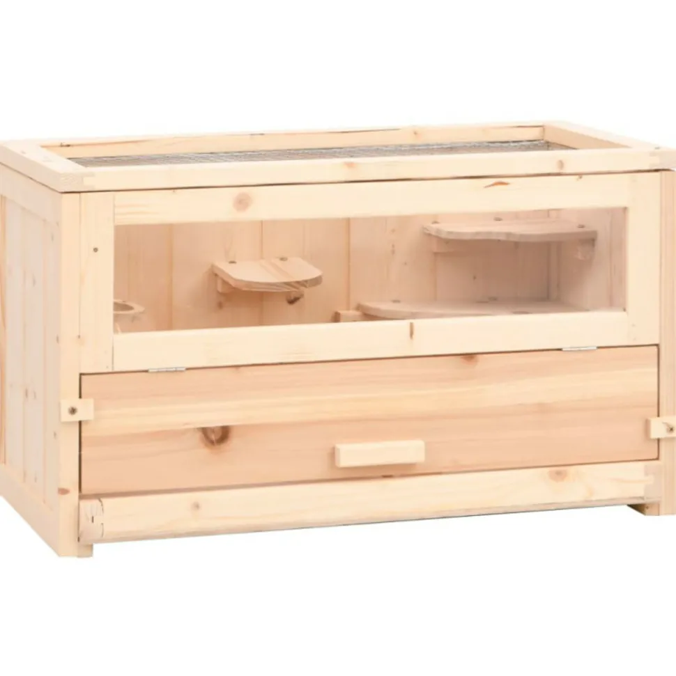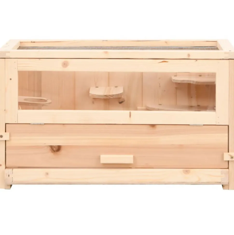 Cette cage à hamster en bois avec de multiples accessoires offre un endroit parfait pour que les petits animaux de compagnie puissent courir. Elle convient également aux petits gerbilles, souris, cochons d’Inde et autres animaux de taille similaire. Bois de sapin massif : le bois de sapin massif est un beau matériau naturel. Le bois de sapin ne se dessèche pas et ne se déforme pas lorsqu’il est exposé à l’humidité. Fabriquée en bois de sapin massif, la maison pour hamster est robuste et facile à nettoyer.Toit en treillis métallique : le toit ouvrable est conçu avec un treillis métallique pour une bonne ventilation et une entrée facile.Visibilité claire : l’écran frontal en acrylique transparent de la cage à souris vous permet de regarder vos amis à fourrure jouer et se détendre dans leur nouvelle maison.Nettoyage facile : la cage à hamster en bois est dotée d’une porte avant et d’un plateau extractible pour faciliter le nettoyage. Matériau : bois de sapin massif (non traité), acrylique, PVC, contreplaquéDimensions totales : 60 x 30 x 35 cm (L x l x H)Dimensions intérieures : 56 x 26,5 x 31 cm (L x l x H)Dimensions du plateau : 52 x 24 x 3,5 cm (L x l x H)Dimensions de la porte : 55,5 x 11 cm (L x H)Taille de la maille : 1 x 1 cm (L x l)L’assemblage est requisMatériau : bois de sapin massif (non traité), acrylique, PVC, contreplaquéDimensions totales : 60 x 30 x 35 cm (L x l x H)Dimensions intérieures : 56 x 26,5 x 31 cm (L x l x H)Dimensions du plateau : 52 x 24 x 3,5 cm (L x l x H)Dimensions de la porte : 55,5 x 11 cm (L x H)Taille de la maille : 1 x 1 cm (L x l)L’assemblage est requis