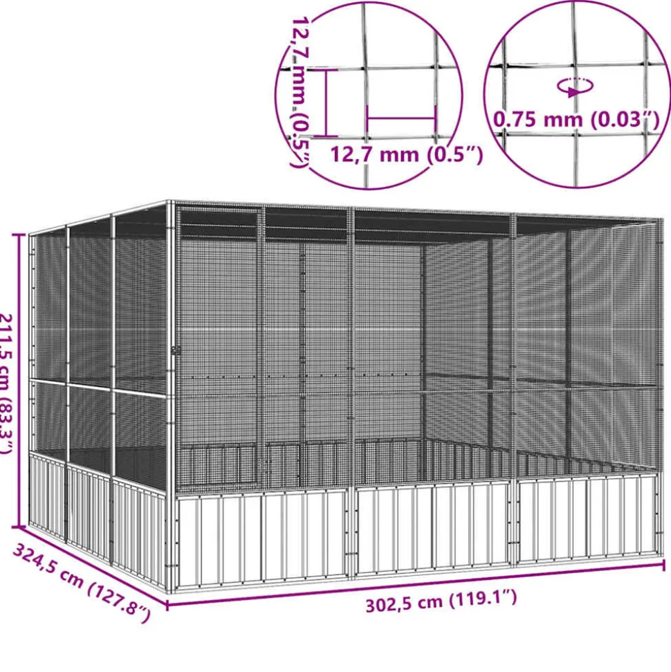 Cette cage à oiseaux offre un grand endroit confortable pour que vos oiseaux volent et jouent en toute sécurité. Volière tout-en-un : la cage polyvalente offre de multiples usages : jouer, faire de l’exercice, dresser ou simplement garder vos oiseaux en sécurité. Ce sera le paradis de jeu parfait pour vos oiseaux !Cadre robuste : grâce à la construction robuste en acier galvanisé, cette cage à perruches est durable et conçue pour durer.Sécurité supplémentaire : la porte à charnière avec un système de verrouillage verrouillable de la cage à perroquet assure une sécurité supplémentaires pour vos oiseaux.Design ventilé : la grande cage à oiseaux a un design en maille, ce qui la rend bien ventilée pour garder l’air frais et propre. Ainsi, la volière extérieure est bénéfique pour la santé de vos petits amis à plumes bien-aimés. Remarque :Chaque produit est livré avec un manuel de montage dans la boîte pour un montage facile. Couleur : anthraciteMatériau : acier galvaniséDimensions : 302,5 x 324,5 x 211,5 cm (l x P x H)Dimensions de la porte : 48 x 152,5 cm (l x H)Couleur : anthraciteMatériau : acier galvaniséDimensions : 302,5 x 324,5 x 211,5 cm (l x P x H)Dimensions de la porte : 48 x 152,5 cm (l x H)