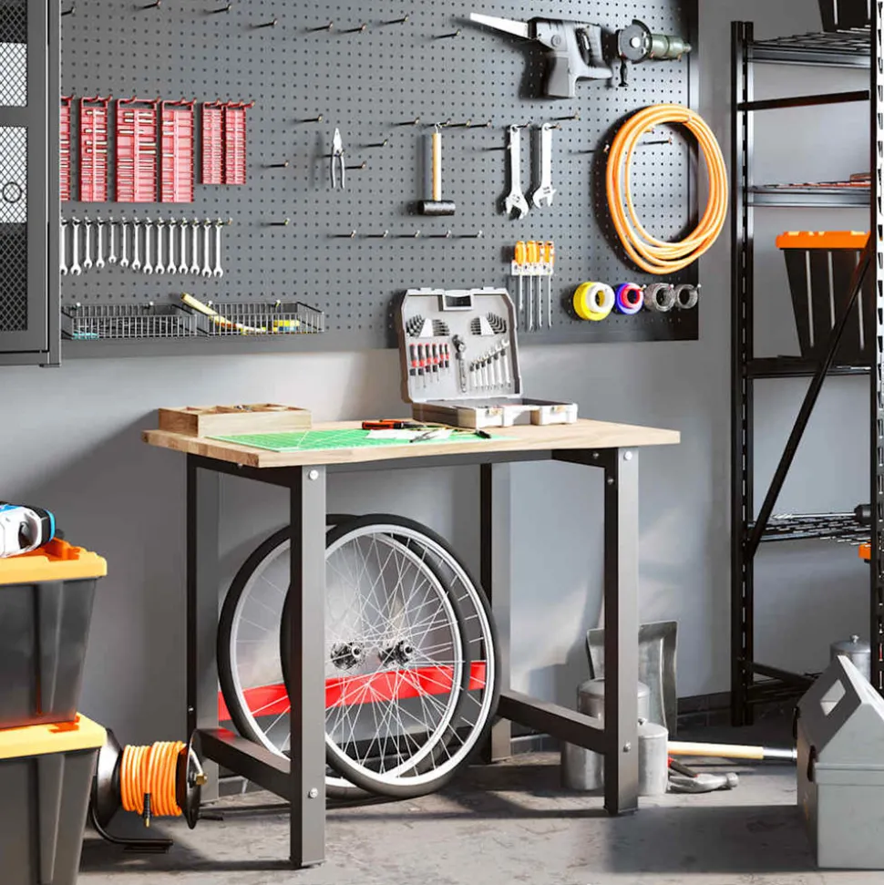 L’établi est une aide précieuse si vous souhaitez terminer des travaux de réparation ou réaliser vos rêves de bricolage ! Matériau robuste et stable : le bois de chêne massif est connu pour sa solidité, sa durabilité et la beauté de son grain, ce qui en fait un matériau idéal pour les meubles de longue durée. Sa résistance naturelle aux insectes et aux champignons permet aux meubles en chêne de rester attrayants et fonctionnels pendant des années.Cadre stable et durable : le cadre en métal enduit de poudre est solide, stable, durable et résistant à la corrosion et aux intempéries, ce qui garantit des performances durables.Grande surface de travail : la table de travail offre une grande surface de travail pour placer vos perceuses, tambours de câble et autres accessoires d’outillage.Utilisation polyvalente : doté d’un design simple et épuré, vous pouvez l’utiliser comme établi ou comme table de travail selon vos besoins. Le poste de travail est conçu pour être un meuble pratique et commode. Bon à savoir :Chaque article est unique, avec des variations de couleurs et de grains. La livraison est aléatoire, ce qui garantit l’exclusivité et l’individualité de votre produit.Nous recommandons d’utiliser un tournevis plutôt qu’une perceuse électrique pour éviter que le bois ne se fissure lors de la fixation des pieds. Attention :Ce dessus de table n’a pas de trous pré-percés et les vis ne sont pas incluses. Les trous doivent donc être pré-percés et les vis doivent être achetées avant d’assembler cette table de travail.