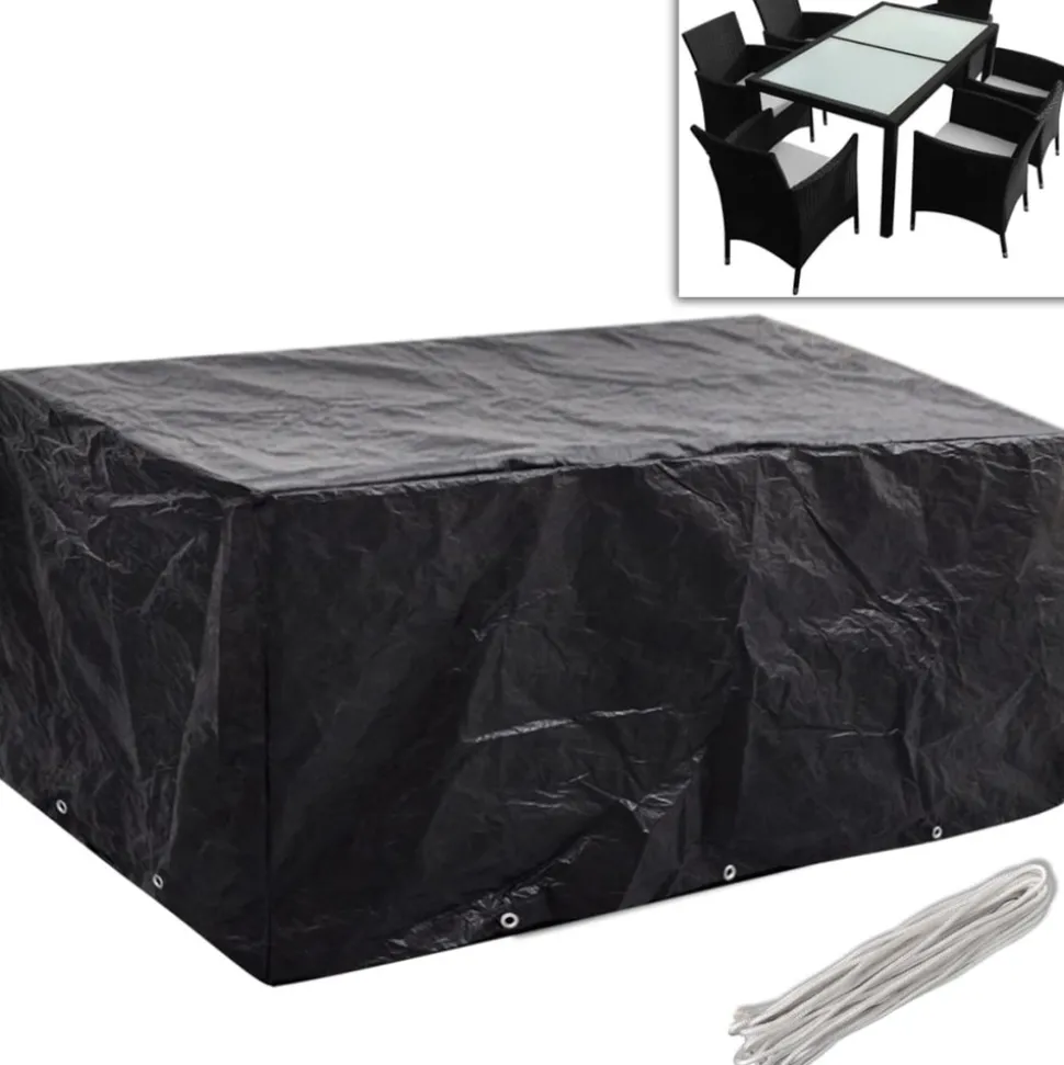 Cette housse de mobilier de jardin de haute qualité est adaptée à la protection toute l’année de vos ensembles de mobilier en rotin de la saleté, du vent, de la pluie et de la lumière UV. La housse est faite de polyéthylène durable, qui est imperméable à l’eau, résistante aux UV, indéchirable et donc adaptée à un usage quotidien. Elle a 10 艙illets en aluminium et une corde de fixation, donc elle s’adaptera mieux à votre meuble. La housse est adaptée à notre ensemble en rotin de 6 personnes avec SKU 40892 / 40893 / 41278. Vous pouvez également utiliser cette housse pour d’autres ensembles de meubles, tant que cela est compatible avec la taille de vos meubles. La livraison comprend 2 housses de mobilier de jardin. Remarque : ce produit n’est pas 100 % étanche. Ainsi, nous vous recommandons de le traiter avec un spray imperméabilisant pour une meilleure fonction d’imperméabilité.
