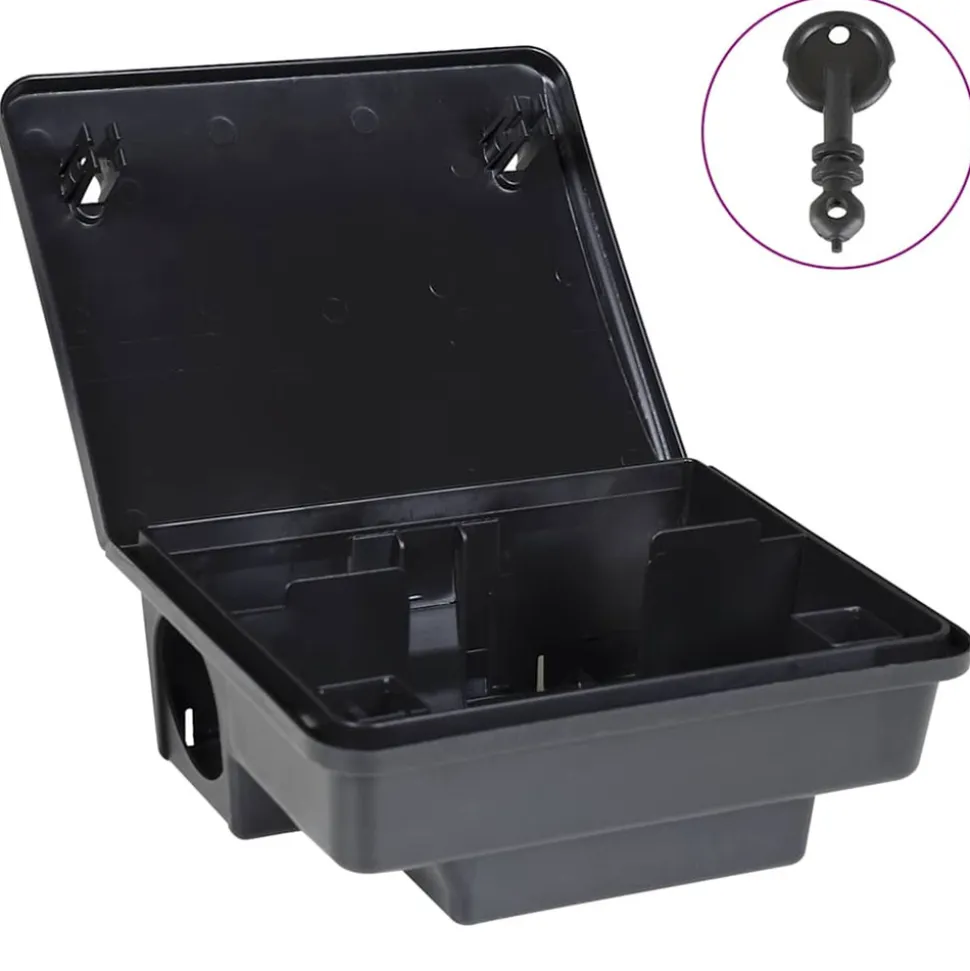 Conçus pour la capture des souris et des rats, ces pièges à souris sont idéaux pour garder votre espace sans rongeurs. Stable et durable : le polypropylène est un matériau polyvalent et durable, apprécié pour sa stabilité, sa résistance à la chaleur et son nettoyage facile. Fabriqué en PP robuste, le plateau convient aussi bien à une utilisation intérieure qu’extérieure, tandis que sa conception facile à nettoyer et à entretenir le rend réutilisable.Facile à utiliser : placez simplement votre poison à rats ou votre appât préféré à l’intérieur du réservoir d’appât amovible et fixez-le avec le fil, ou enfilez le bloc sur le fil fourni, fermez le couvercle de verrouillage et le tour est joué !Sécurité enfants et animaux domestiques : dotée d’un couvercle entouré d’un système de sécurité, la boîte à appâts empêche toute ouverture forcée à la main et ne peut être ouverte qu’avec la clé fournie, ce qui la rend sûre pour les enfants et les animaux domestiques.Installation sécurisée : le piège à rongeurs est doté d’un support de montage qui permet une installation stable, garantissant que le piège reste en place et ne peut pas être retiré facilement. Le matériel de montage n’est pas inclus.Compatibilité polyvalente des appâts : la station d’appât pour rats fonctionne avec des rodenticides en pâte, en bloc ou en céréales, vous offrant ainsi une flexibilité dans votre stratégie de lutte contre les rongeurs. Vous pouvez également utiliser une planche à colle (non incluse) à l’intérieur. Bon à savoir :Pour remplacer le rodenticide, utilisez des gants pour éviter le contact direct.Placez la boîte dans des endroits où elle est visible pour le passage des rongeurs.L鈥檜tilisation de pièges peut nécessiter une dérogation, un permis ou une licence. Veuillez respecter toutes les lois locales, étatiques et nationales concernant ce produit.