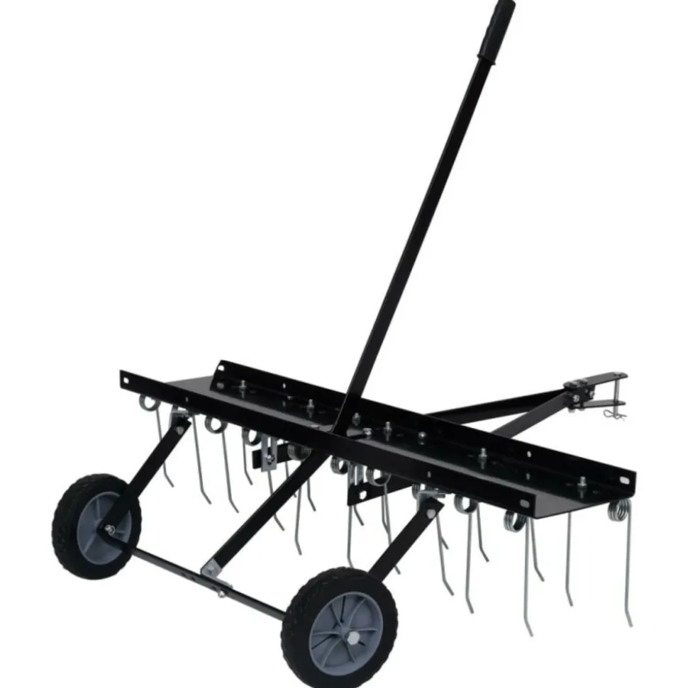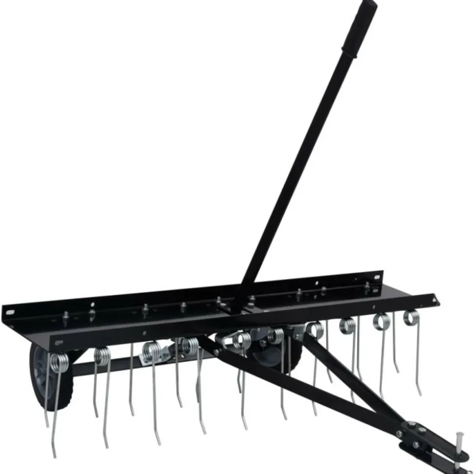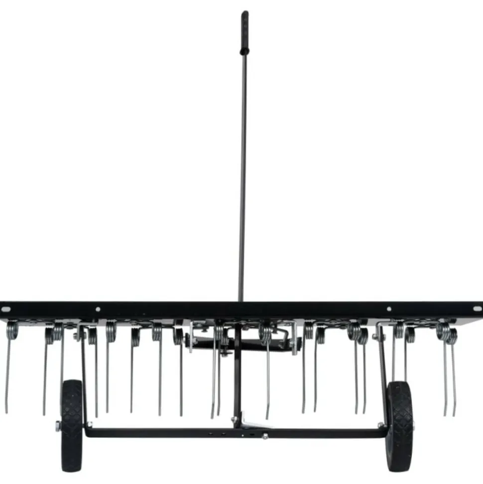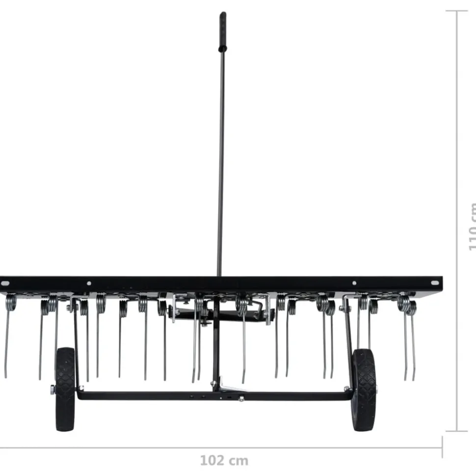 Avec ce scarificateur pour tondeuse autoportée, même les grandes pelouses peuvent être rapidement et facilement nettoyées de la mousse et d’autres mauvaises herbes et aérées efficacement de sorte que la pelouse puisse développer une croissance meilleure et plus dense. Avec l’accouplement, le peigne de pelouse peut être facilement et en toute sécurité connecté à la tondeuse ou au tracteur à gazon, à condition qu’il dispose d’un dispositif d’accouplement. Dans le cas d’une croissance particulièrement dense de mousse, le scarificateur peut être alourdi avec des poids supplémentaires (non inclus dans la livraison) de sorte que les ressorts en acier galvanisé reposent sur la pelouse avec une pression plus élevée et élimine la mousse encore plus. Couleur : noirMatériau : AcierDimensions hors tout : 102 x 85 x 37 cm (L x l x H)Largeur de fonctionnement : 100 cmDent en acier traité thermiquement 3/1620 dentsDents en acier à ressort pour une longue durée de vieAttelage de pneu à axe 1/2Poids : 14 kgCouleur : noirMatériau : AcierDimensions hors tout : 102 x 85 x 37 cm (L x l x H)Largeur de fonctionnement : 100 cmDent en acier traité thermiquement 3/1620 dentsDents en acier à ressort pour une longue durée de vieAttelage de pneu à axe 1/2Poids : 14 kg