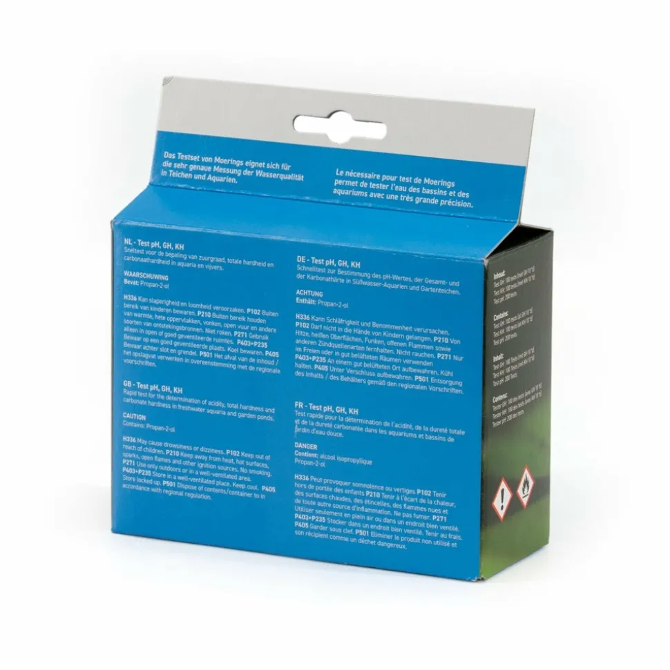 Coffret analyse de l’eau : test du pH, du KH et du GH grâce au kit Moerings Aqua TestLe set d’analyse de l’eau Moerings contient 3 flacons de produits révélateurs. Son utilisation est très simple : vous versez 5ml d’eau de votre bassin dans le flacon de test, puis vous versez dedans le produit pH, KH ou GH. Et vous lisez directement les résultats sur la notice selon la couleur de l’eau obtenue après mélange avec le produit révélateur.Comment utiliser Moerings Aqua Test ?Pour tester le pH de l’eauL’analyse du pH permet de savoir si l’eau est trop acide ou pas assez, et de réajuster si nécessaire.- Versez 5ml d’eau du bassin dans le flacon-test- Ajoutez 5 gouttes de produits pH dans le flacon-test- Remuez doucement- Placez le flacon-test devant le nuancier pour connaître la valeur du pH de votre eau- Videz et rincez abondamment le flacon-testUn pH de 7 est correct, autrement vous devrez intervenir pour ajuster avec Moerings Pond Pro (disponible en bas de cette page)Pour tester le KH de votre bassinL’analyse du KH permet de connaître la dureté carbonatée (taux de CO2) de l’eau.- Versez 5ml d’eau du bassin dans le flacon-test- Ajoutez le produit KH dans le flacon, une goutte après l’autre- Quand l’eau passe du bleu au jaune, comptez le nombre de gouttes que vous avez ajouté : il correspond à la valeur du KH- Rincez abondamment le flacon de testLe KH doit être supérieur à 8, si ce n’est pas le cas, rééquilibrez votre eau avec Moerings KH Plus (disponible en bas de cette page).Pour tester le GH de l’eauL’analyse du GH permet de connaitre la dureté de l’eau et de la corriger si elle est trop douce.- Versez 5ml d’eau dans le flacon-test- Ajoutez le produit GH dans le flacon, une goutte après l’autre- Quand l’eau passe du rouge au vert, comptez le nombre de gouttes que vous avez ajouté : il correspond à la valeur du GH- Rincez abondamment le flacon de testLe GH doit être supérieur à 12, si ce n’est pas le c…